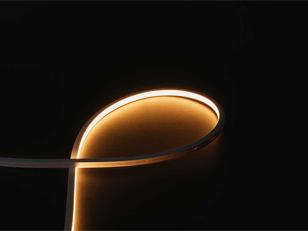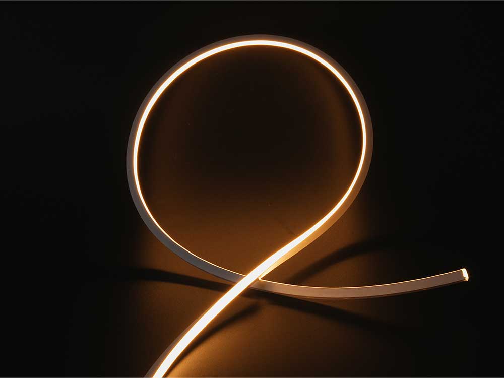 0606硅胶覓虹灯带,单面正发光,垂直弯曲,采用硅胶一体挤压成型工艺 ,防水等级IP67,柔韧性佳,最小弯曲直径100mm,具有耐黄变,耐高温,抗UV,耐酸碱等优良特性,发光均匀,光色纯正明亮,无光斑,可以塑造不同的形状,适用于室内外线性亮化照明。